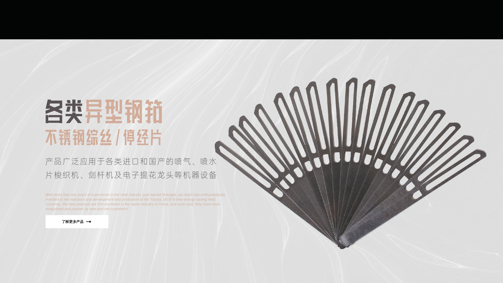 憑借十多年鋼筘行業(yè)經(jīng)驗(yàn)及對市場的前瞻性,我們團(tuán)隊滿懷熱情的投入到豐田JAT810新型節(jié)能鋼筘的研發(fā)和生產(chǎn)當(dāng)中,目前新產(chǎn)品在國內(nèi)同行業(yè)中先行上市銷售,一經(jīng)銷售就得到了新老客戶的認(rèn)可和好評!